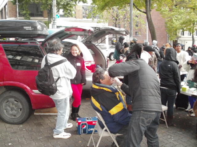 *helpen met daklozen maaltijden koken en serveren / kleding voor hen wassen en uitzoeken.